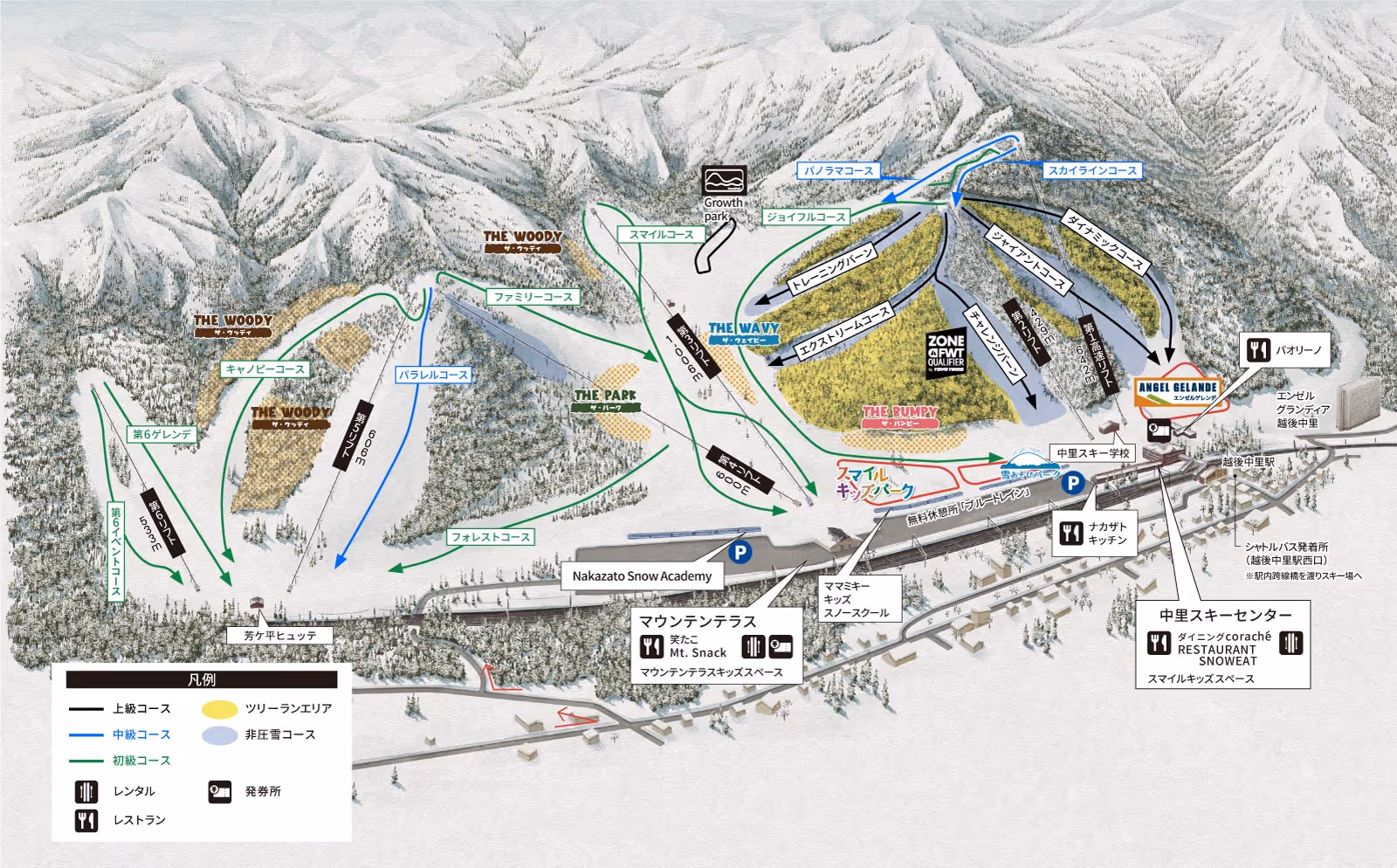 湯澤中里滑雪場(Yuzawa Nakazato Snow Resort)位於越後湯澤地區,搭乘新幹線至越後湯澤車站後,轉乘免費接駁巴士,約10至14分鐘內即可抵達。湯澤中里滑雪場旁就是Angel Grandia越後中里飯店(エンゼルグランディア越後中里),不過走過來湯還是有一點距離,可以選擇搭乘接駁車來雪場,進雪場的路線也比較特別,要先進JR月台,然後走上天橋後,從天橋可以直接走到雪場的滑雪中心。雪道以寬廣和平緩著稱,對於家庭或是初學者來說是不錯的選擇,是理想的入門滑雪場。